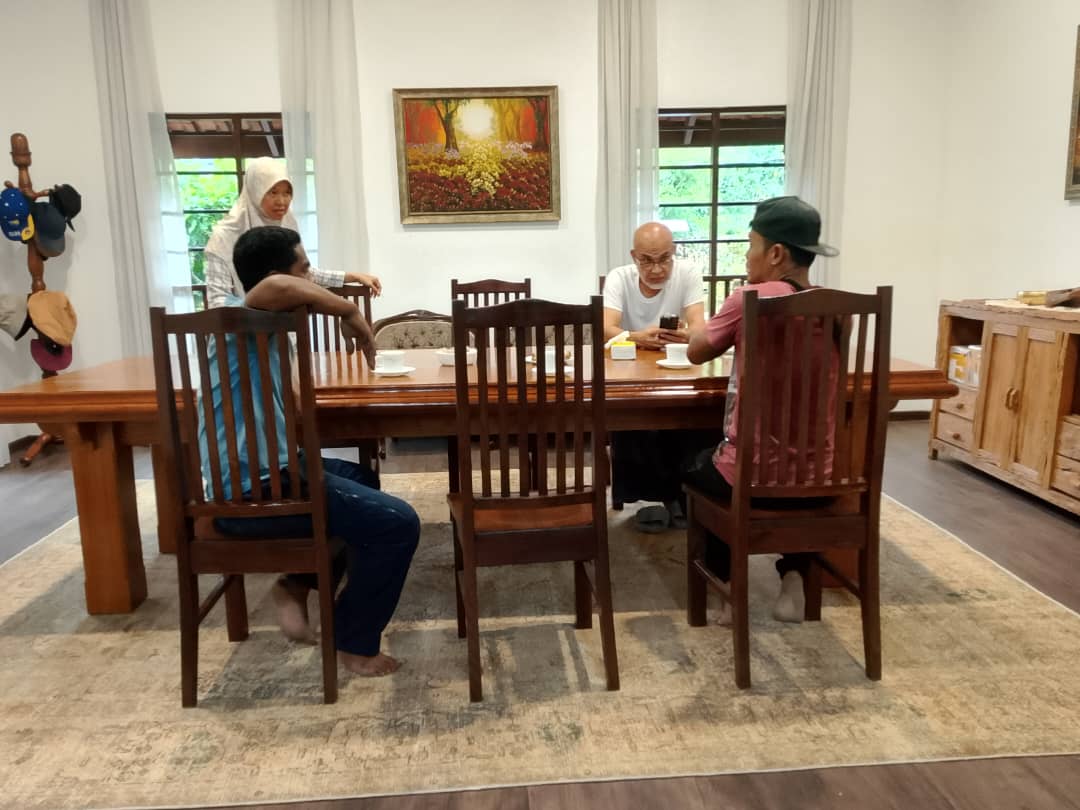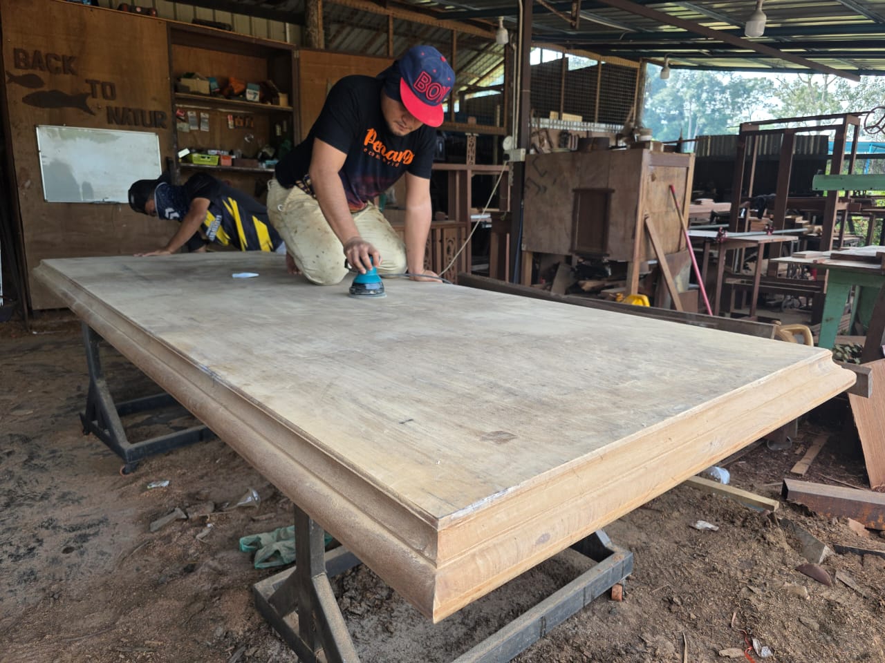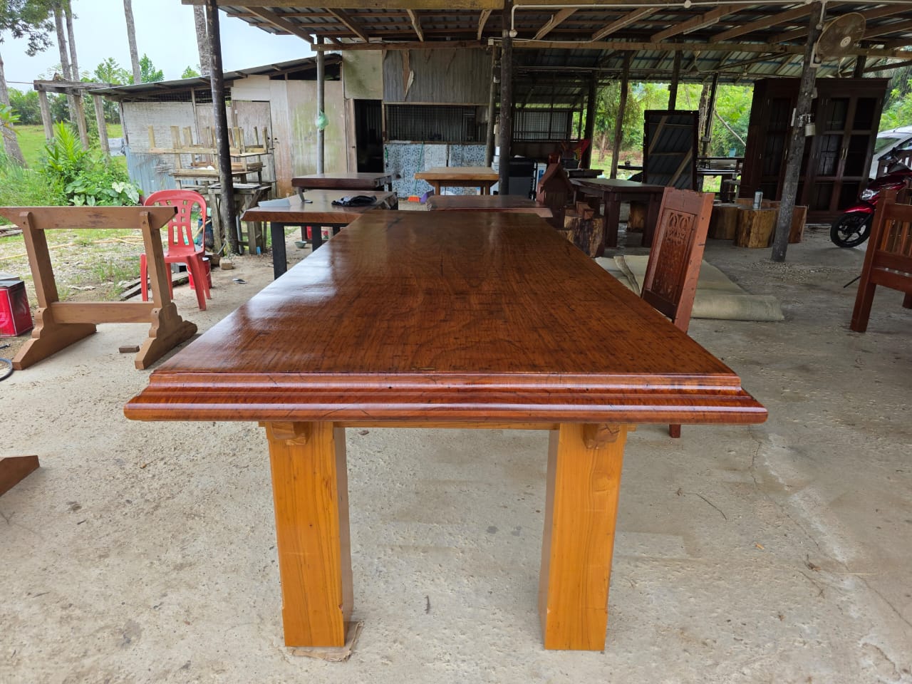 Lengkapkan ruang rumah atau pejabat anda dengan sentuhan mewah meja slab kayu cengal asli berrekaan bendul klasik.